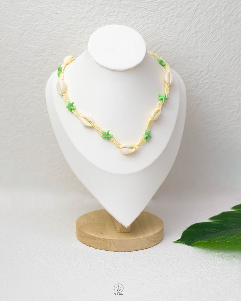 free size summer Beige seashell and tiny green stars necklace