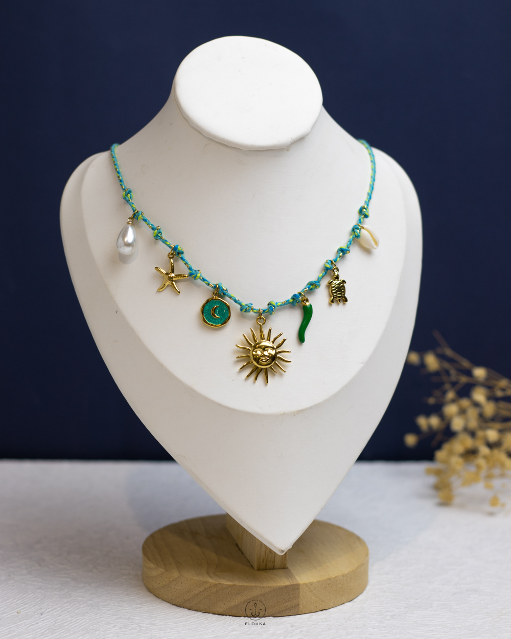 turquoise fagbric seashell & sun necklace