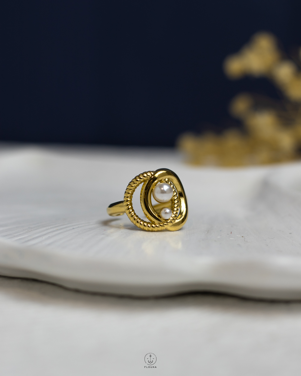 white beads gold free size ring